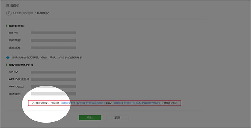 2. 填寫相關已認證APPID信息,閱讀并簽署《微信支付商戶號與APPID授權協議》,點擊“確認”提交,發起授權申請;