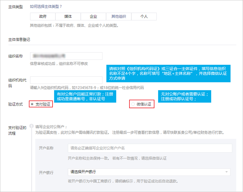 5、選擇其他組織之后,填寫組織名稱、組織機構代碼,選擇注冊方式;
