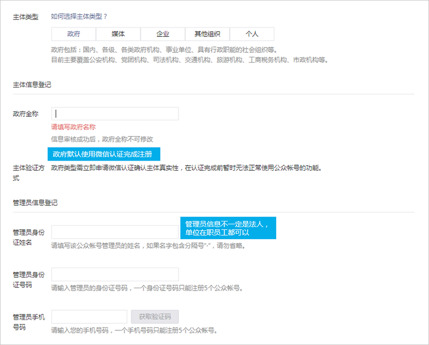 5、選擇政府之后,填寫組織名稱、管理員信息,繼續;